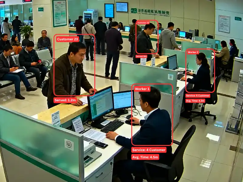 Sistem menganalisis aktivitas operasional secara menyeluruh, seperti kondisi teller (aktif atau standby), interaksi dengan nasabah, serta alur pelayanan. Seluruh aktivitas dapat dipantau secara real-time.