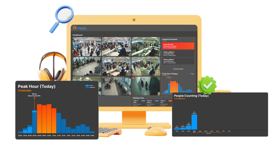 Cegah akses tidak sah serta pantau aktivitas operasional bank secara menyeluruh dalam satu dashboard terintegrasi. Didukung teknologi AI, sistem dapat memprediksi peak hour, dan menghitung jumlah pengunjung secara real-time!